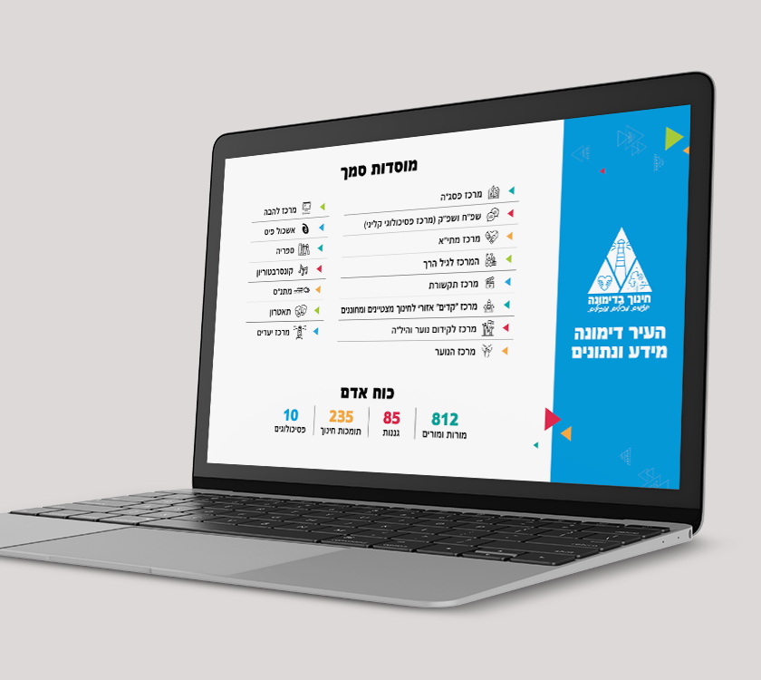 עיריית דימונה עיריית דימונה: העיר דימונה נוסדה בשנת 1955, והיא העיר השנייה בגודלה באזור הנגב. לעיר מערכת חינוך מהמובילות בישראל. עיצוב סמל | עיצוב חוברת לפרס חינוך עיצובים נוספים למוסדות ולארגונים
