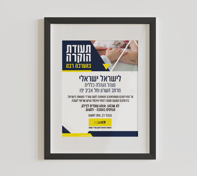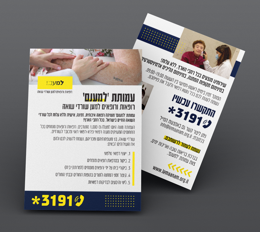 למענם עמותת 'למענם’: העמותה מעניקה שירותי רפואה איכותית, זמינה, אישית וללא עלות לכל שורדי השואה החיים בישראל. עיצוב פליירים | תעודות הוקרה| עיצוב באנרים | עיצוב שלטי חוצות | מיתוג לרכב | עיצוב פרסומים שונים עיצובים נוספים למוסדות ולארגונים