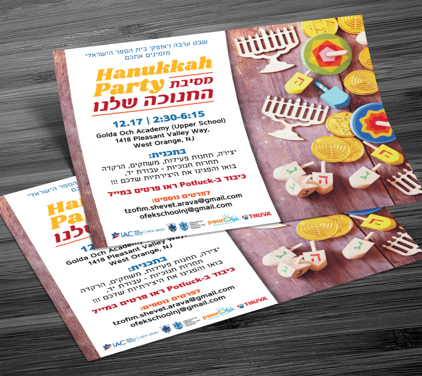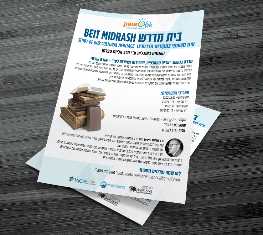 אופק - בית ספר ברוח ישראלית 'אופק' בית ספר בארוח ישרלית הינו ארגון ללא מטרות רווח הדוגל בבנית קשר עם ישראל, תרבות ומורשת תוך העצמת השפה העברית, במשפחות הקהילה במרחב מטרו-ווסט, ניו גרז'י, ארה"ב. עיצוב פרסומים שונים עיצובים נוספים למוסדות ולארגונים